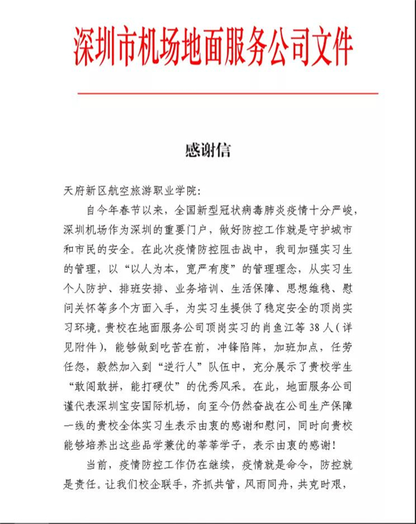 近日,我院收到了一封來自深圳市機(jī)場地面服務(wù)公司的感謝信,信中說,深圳機(jī)場作為深圳的重要門戶,做好防控工作就是守護(hù)城市和市民的安全。在此次疫情防控阻擊戰(zhàn)中,貴校在地面服務(wù)公司頂崗實(shí)習(xí)的肖魚江等38人,沖鋒陷陣,加班加點(diǎn),任勞任怨,毅然加入到“逆行人”隊伍中,充分展示了貴校學(xué)生“敢闖敢拼,能打硬仗”的優(yōu)秀風(fēng)采。
