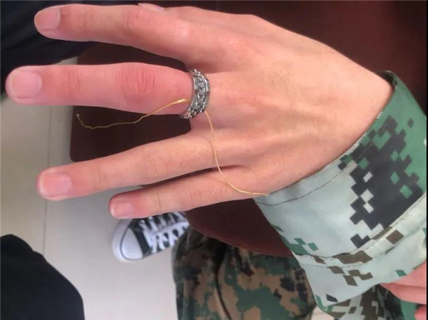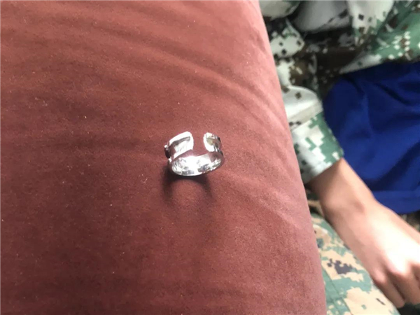“沒事,不用擔(dān)心,我們保證給你取下來(lái),你只需要放輕松,”代坤輝指導(dǎo)、蒙程班長(zhǎng)、以及四名消防戰(zhàn)士一邊安慰何定倡同學(xué),一邊觀察他的手指。消防官兵發(fā)現(xiàn)何定倡同學(xué)中指上戴著一枚銀白色的戒指,由于長(zhǎng)時(shí)間擠壓,手指因血流不暢已出現(xiàn)腫脹現(xiàn)象。