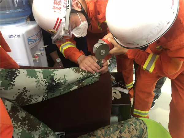消防官兵立即用打磨機(jī)、鉗子、小鋸子等工具小心翼翼地進(jìn)行處理,并不斷詢問(wèn)是否疼痛,有何不適。由于擔(dān)心會(huì)傷到手指,消防官兵將礦泉水瓶剪成一片片墊在何定倡同學(xué)手指與戒指之間,然后用小型切割機(jī)對(duì)戒指進(jìn)行切割。為防止切割過(guò)程中產(chǎn)生的熱量對(duì)男生手指造成二次傷害,消防官兵不時(shí)往其手指上澆水冷卻降溫。經(jīng)10多分鐘左右的努力,只聽見“咔嚓”一聲,手指上的戒指應(yīng)聲斷開,最終成功將戒指取下。
