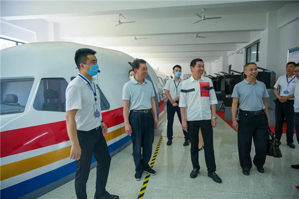 在學(xué)院的軌道交通實(shí)訓(xùn)室,辜英智向宋思彬一行介紹了模擬動(dòng)車的每個(gè)環(huán)節(jié),從高鐵購票、安檢、上車、運(yùn)行到下車。隨后,坐上校園觀光車,辜英智向宋思彬詳細(xì)介紹了鐘樓,體育場,多彩大講堂等特色建筑。