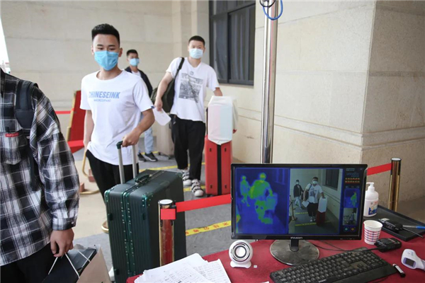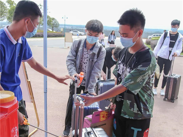 在學(xué)校大門,設(shè)置了測(cè)溫專用通道,每個(gè)回家的學(xué)子在行李、衣服消毒后,依次排隊(duì)走過熱成像測(cè)溫儀,體溫異常的,將進(jìn)行人工額溫測(cè)定。然后,到班主任處報(bào)到,出示身份信息及健康碼才可進(jìn)入宿舍。
