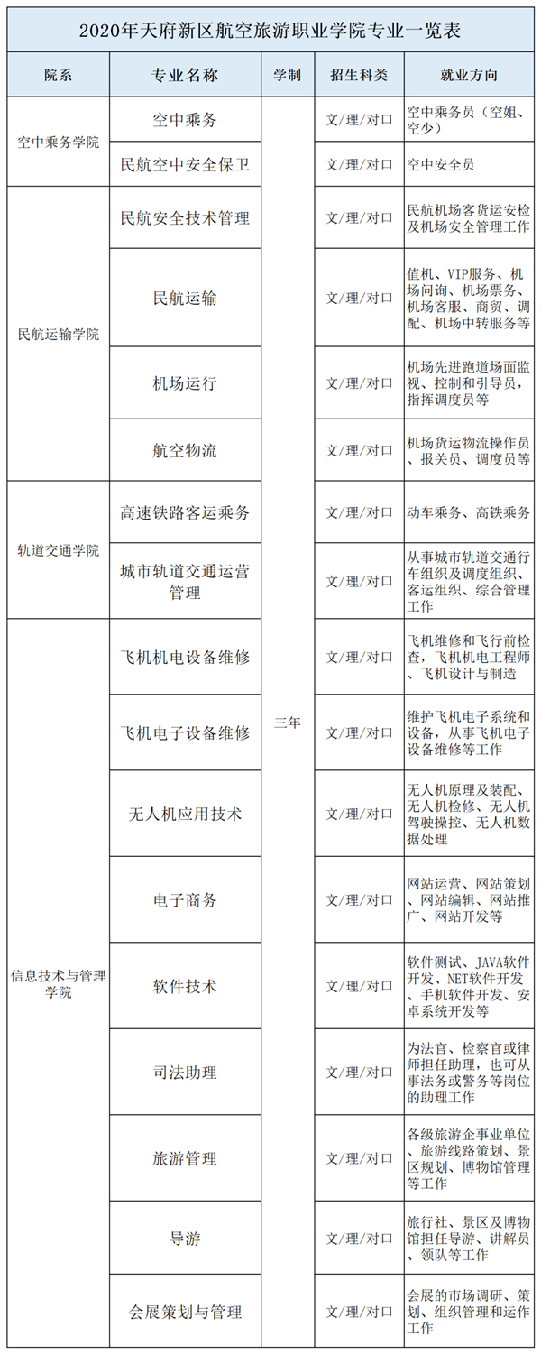 注:各省份具體招收計劃詳見“2020年天府新區(qū)航空旅游職業(yè)學院各省份招生計劃及代碼表”。