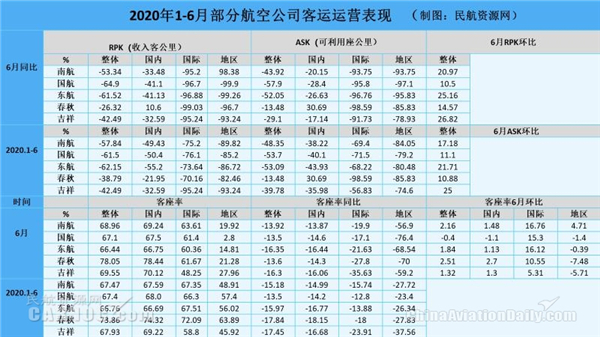 圖:2020年1-6月部分航司客運(yùn)運(yùn)營(yíng)表現(xiàn) 制圖:民航資源網(wǎng)