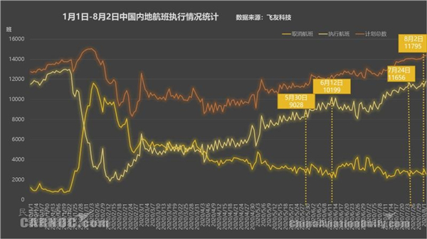 圖:1月1日-8月2日中國(guó)內(nèi)地航班執(zhí)行情況統(tǒng)計(jì)數(shù)據(jù)來(lái)源及分析:飛友科技