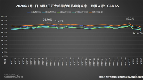圖:7月1日-8月3日國(guó)、東、南、海、吉祥航五大航司客座率數(shù)據(jù)來(lái)源:CADAS