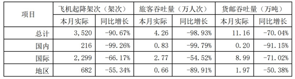 4月旅客吞吐量4.26萬人次,同比下降98.93%;貨郵吞吐量11.16萬噸,同比下降70.04%;飛機(jī)起降架次3520架次,同比下降90.67%。