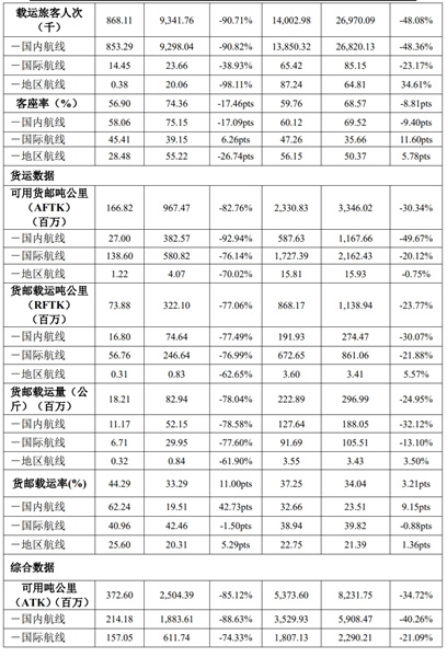 4月運(yùn)載旅客37.6萬人次,同比下降83.08%;旅客周轉(zhuǎn)量環(huán)比下降52.44%,同比下降81.84%;客座率66.67%,環(huán)比下降0.87%,同比下降21.57%。貨郵載運(yùn)量3102噸,同比下降44.44%。