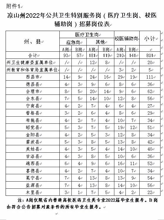 附件:1.涼山州公共衛(wèi)生特別服務崗(醫(yī)療衛(wèi)生崗、校醫(yī)輔助崗)招募崗位表