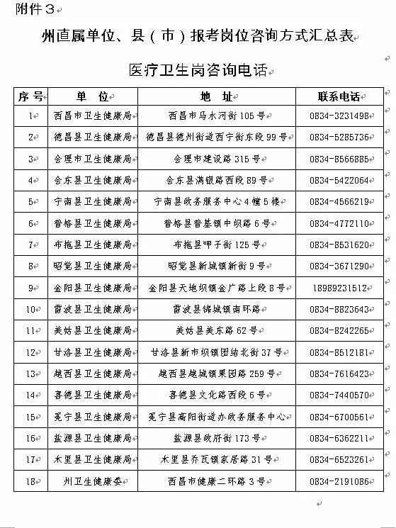 醫(yī)療衛(wèi)生崗咨詢電話:涼山州衛(wèi)生健康委,電話:0834-2191086