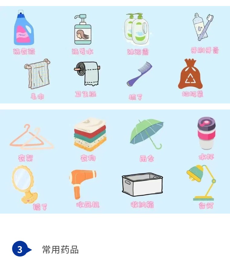 鏡子、梳子、指甲鉗、衛(wèi)生紙、水杯、衣架、粘鉤、雨傘、小鎖頭、針線盒、毛巾、洗衣液、肥皂、插排、吹風(fēng)機(jī)(特別提醒:功率一定要在800W以下!?。。┻€有一些洗漱化妝的用品也記得準(zhǔn)備上。