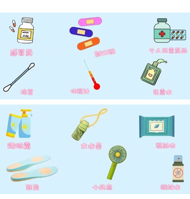 準(zhǔn)備好一些常見的醫(yī)藥品,比如感冒藥、退燒藥、防暑藥物、止瀉藥、碘酒、創(chuàng)口貼、醫(yī)用棉簽、跌打損傷藥等。
