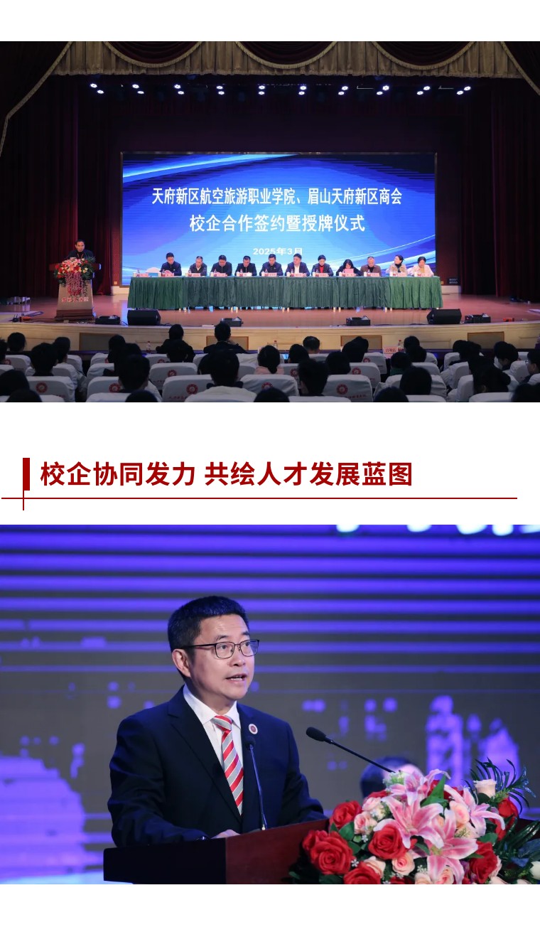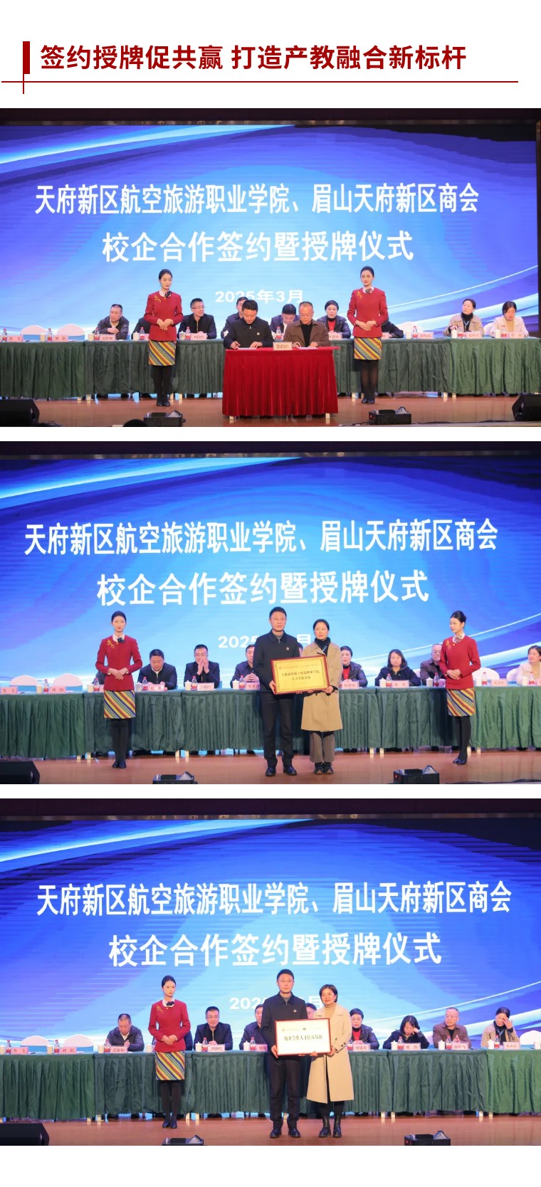 3月11日,天府新區(qū)航空旅游職業(yè)學(xué)院與眉山天府新區(qū)商會(huì)舉行校企合作簽約暨授牌儀式。眉山市人大常委會(huì)副主任、天府新區(qū)眉山黨工委常務(wù)副書(shū)記廖仁軍,眉山市委統(tǒng)戰(zhàn)部副部長(zhǎng)、市工商聯(lián)黨組書(shū)記何建瓊,眉山天府新區(qū)一級(jí)調(diào)研員陳青松,眉山市工商聯(lián)黨組成員、副主席劉前線(xiàn),天府新區(qū)眉山黨工委黨群工作部副部長(zhǎng)潘燕,天府新區(qū)眉山黨工委黨群工作部副部長(zhǎng)王冰,眉山天府新區(qū)商會(huì)會(huì)長(zhǎng)范松如,四川新達(dá)粘膠科技有限公司總經(jīng)理郭明高,四川五洲仁信科技有限公司總經(jīng)理鄧永紅,四川厚天科技股份有限公司總經(jīng)理蔡敏,四川東星航空教育集團(tuán)董事長(zhǎng)、天府新區(qū)航空旅游職業(yè)學(xué)院總督學(xué)辜英智,天府新區(qū)航空旅游職業(yè)學(xué)院院長(zhǎng)劉陽(yáng)等學(xué)校相關(guān)領(lǐng)導(dǎo)及師生代表共同見(jiàn)證這一重要時(shí)刻。