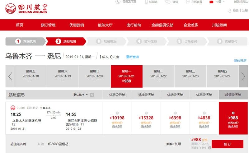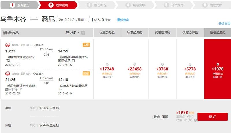 開航初期,川航特別推出烏魯木齊始發(fā)特惠價(jià)格,現(xiàn)預(yù)訂2019年1月21日至1月28日、2月11日至2月21日烏魯木齊至悉尼航班單程300元人民幣起,往返400元人民幣起;預(yù)訂2019年1月29日至2月10日烏魯木齊至悉尼航班單程1000元人民幣起,往返1200元人民幣起。特惠價(jià)格數(shù)量有限,售完即止(以上價(jià)格未含稅,烏魯木齊至悉尼單程稅費(fèi)約700元人民幣,往返稅費(fèi)約1600元人民幣)。