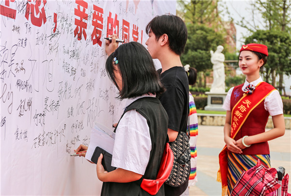 歡快的迎賓曲在學院上空縈繞,一條百余米長的紅色地毯,從校門外延伸至校內(nèi)的瑞麗廣場,兩旁的粉紅色路引花臺和簽到墻正面的櫻花花門浪漫又拉風,粉紅色花門兩旁人頭攢動,由200多名學生組成的“親友團”做好了歡迎同學的準備……