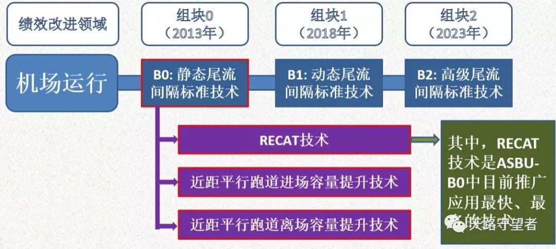 ICAO于2012年發(fā)布的ASBU機(jī)場(chǎng)運(yùn)行引線(xiàn)中,給出了在三個(gè)組塊/時(shí)間節(jié)點(diǎn)下的尾流間隔模塊,明確提出了縮減尾流間隔的“三步走”計(jì)劃,RECAT則是第一步(WAKE-B0)的重要組成部分。