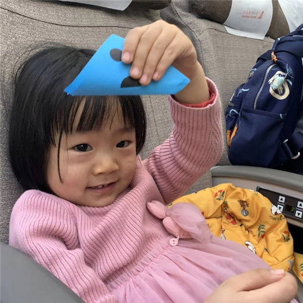 她,叫張向瑩,她叫自己“張?zhí)}卜”,上機(jī)的時(shí)候就發(fā)現(xiàn)她就格外的開(kāi)心,在忙完工作的閑暇之余,乘務(wù)員拿了份折紙給張?zhí)}卜小朋友,古靈精怪的她折好了一張,她害羞的告訴我這是她折的“榴蓮披薩”。